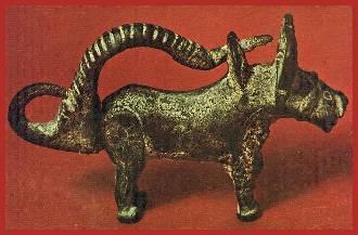 Bronze water buffalo with barbed spring mechanism. 8th to 10 centuries. 6.4 x 4.5 cm.